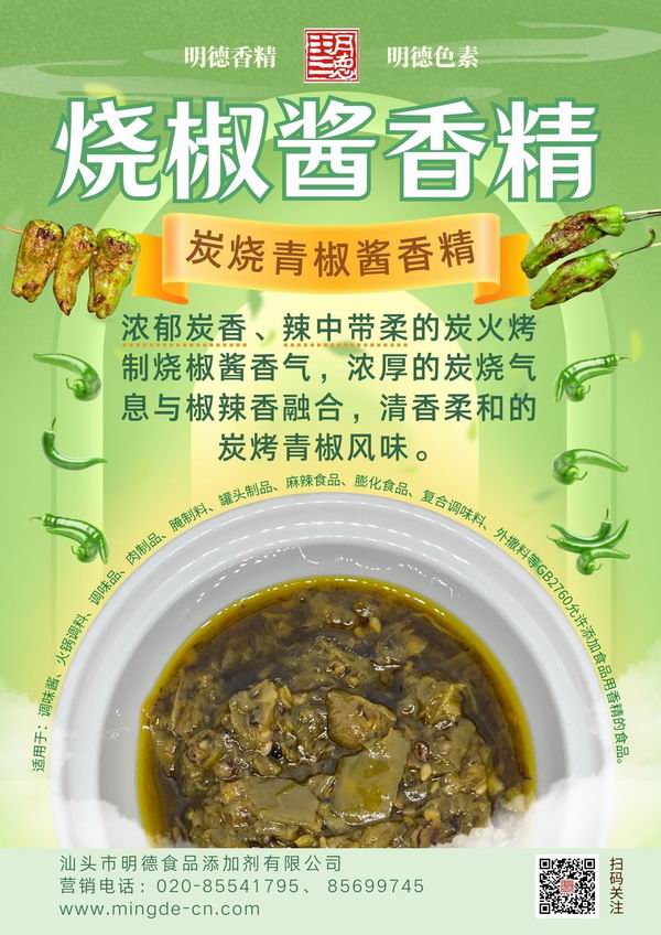 炭火烤制燒椒醬風味 應用于拌飯醬、辣醬中,炭烤香與青椒辣椒香結合,辣中帶柔,清香柔和,醬香十足,香氣撲鼻。明德 燒椒醬香精 耐溫性好、適用性廣、融合度高、香味醇厚。產(chǎn)品參數(shù)