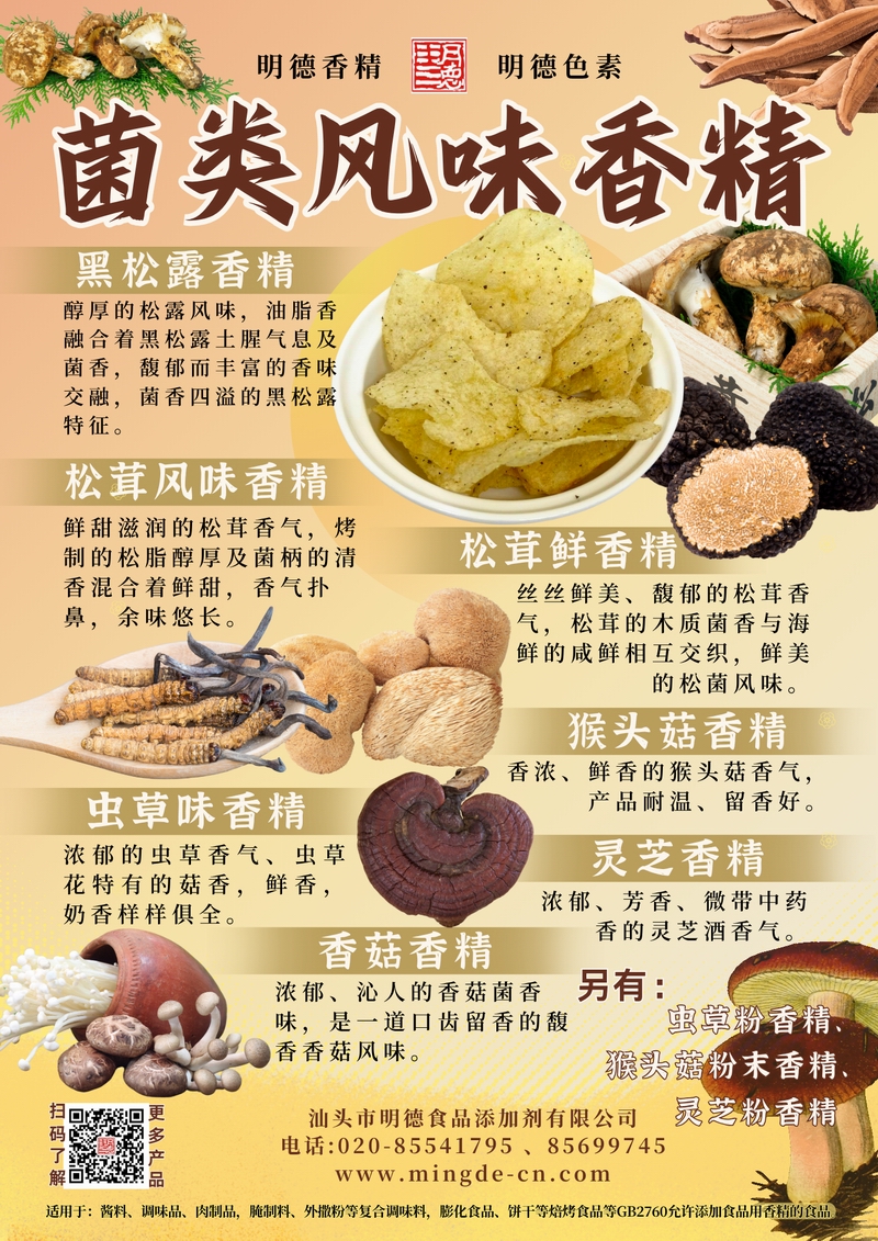 汕頭市明德食品添加劑有限公司的菌類風味香精系列,涵蓋黑松露、松茸、蟲草、猴頭菇、靈芝、香菇等多種風味,并配有粉末型產(chǎn)品。產(chǎn)品菌香真實、留香持久、層次豐富,適用于湯料包、醬料、調(diào)味品、肉制品、腌制料及外撒粉、復(fù)合調(diào)味料,膨化食品、餅干等焙烤食品等B端應(yīng)用,幫助工廠打造具有辨識度的菌類風味產(chǎn)品。