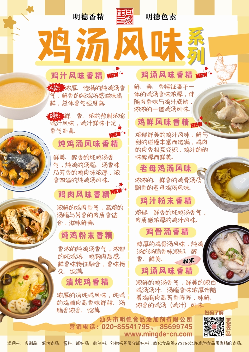 明德雞湯風味香精 濃郁鮮香 還原地道雞湯本味汕頭市明德食品添加劑有限公司的雞湯風味香精系列,涵蓋雞汁、雞湯、雞鮮風味、老母雞湯、雞肉風味、雞粉末、雞骨湯、清燉雞等多種品類。產(chǎn)品具備真實的雞肉鮮香、湯香、油香與骨香特征,能夠為醬料、調(diào)味品、肉制品、腌制料及復(fù)合調(diào)味料等B端應(yīng)用提供穩(wěn)定、濃郁的雞湯風味解決方案,幫助工廠快速打造風味醇厚、回味悠長的雞香產(chǎn)品。